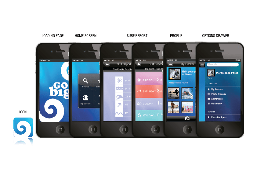 Interface design for a Surf App. Group project for “Graphic Elements for iPhone & iPad” at Istituto Europeo di Design (IED) Florence, Italy.